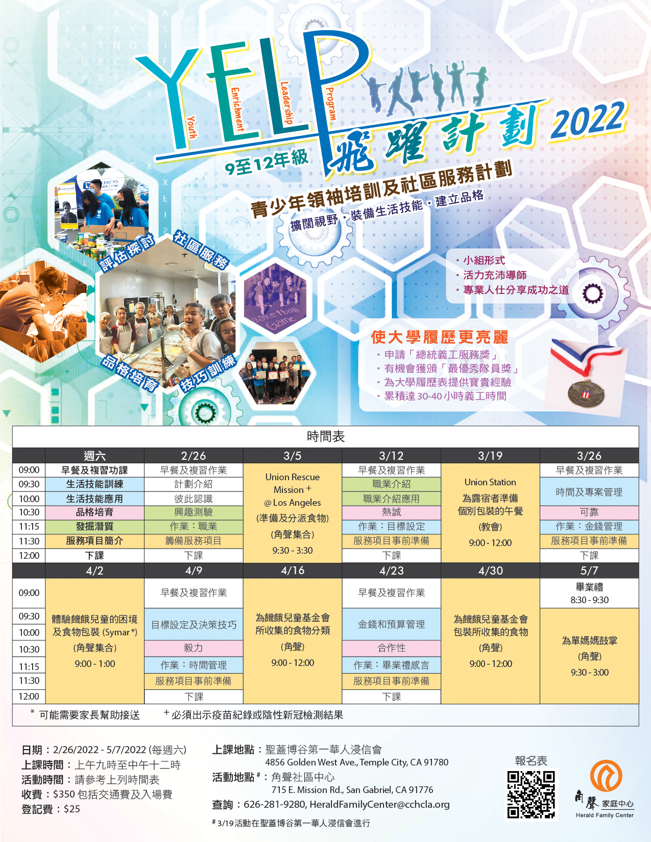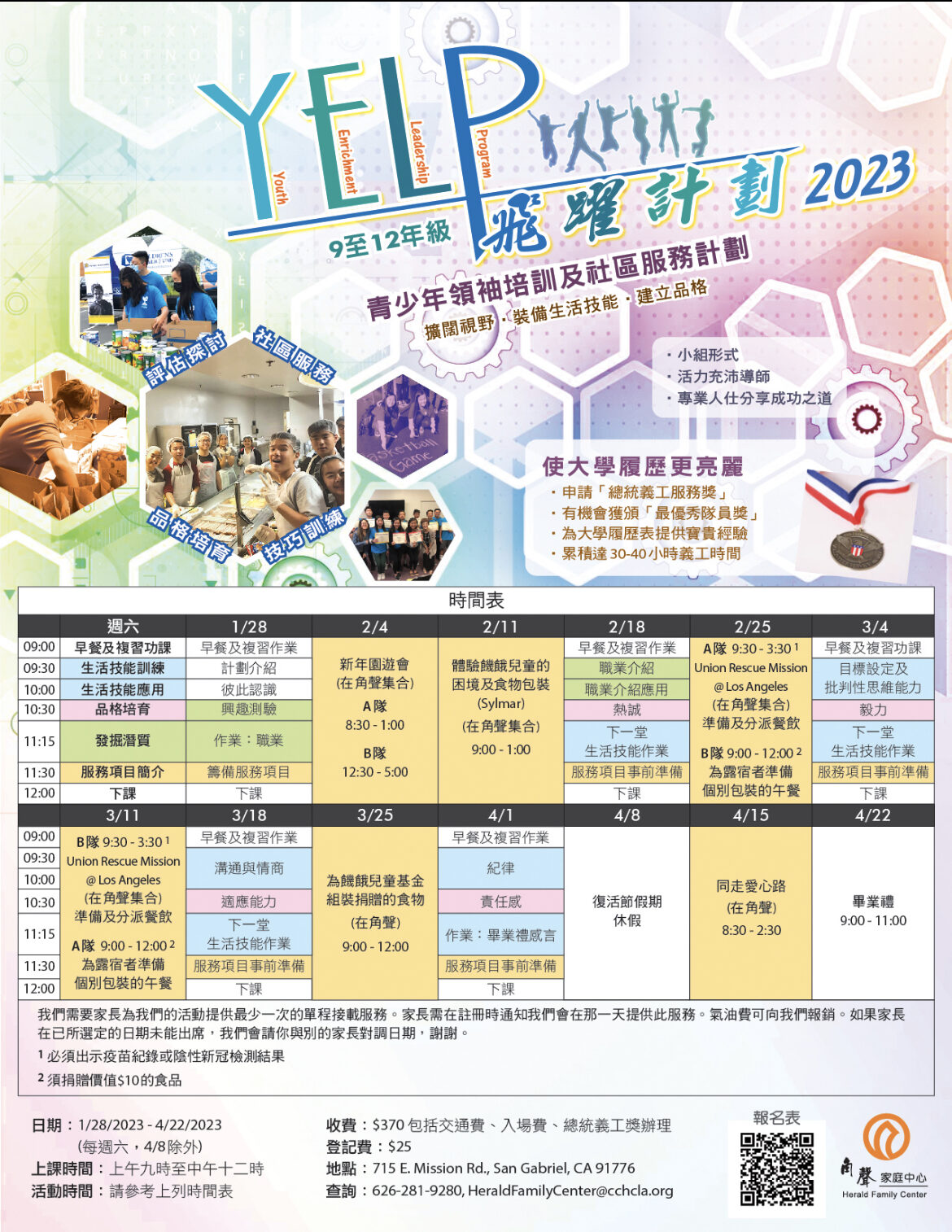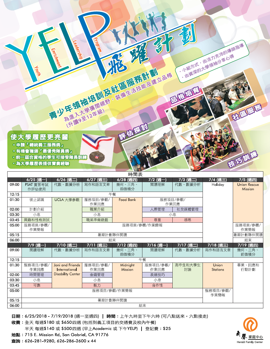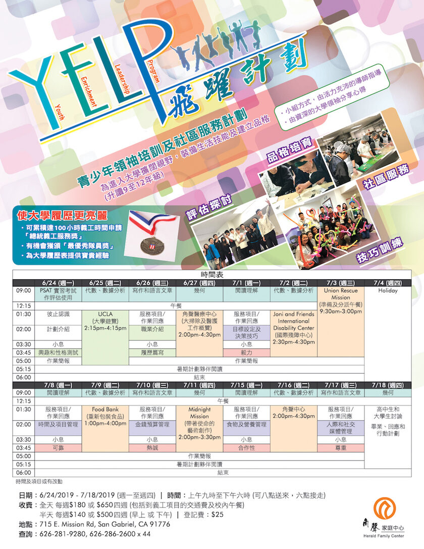 YELP 是一個曠闊視野、裝備技能,培育品格的青少年計劃。中學生可透過社區服務累積義工時間,更可申請由政府頒發的「總統義工服務獎」。今年設有由GBC International Bank Foundation贊助的低收入補助。