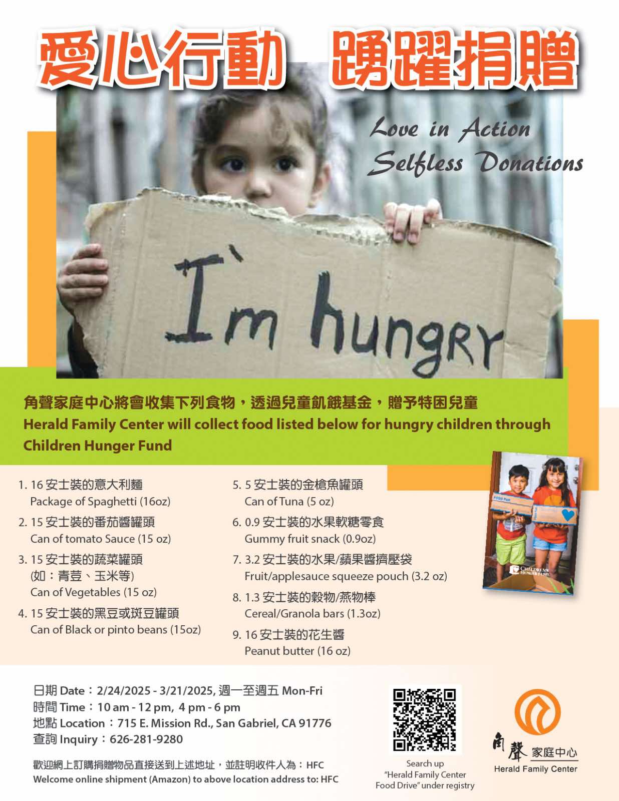 Herald Family Center is collecting food donations for hungry children through Children Hunger Fund! 🍽️ Every small contribution makes a BIG difference!