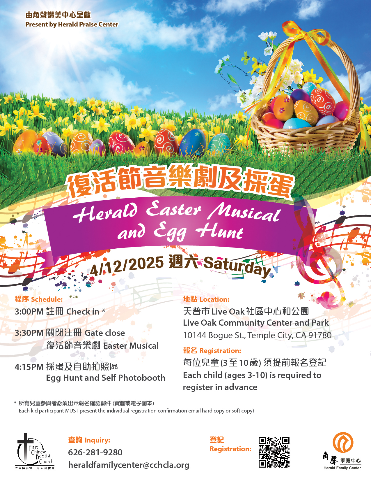 🌸 Join us for a fun-filled Herald Easter Musical and Egg Hunt on April 12, 2025 at the Live Oak Community Center and Park in Temple City! 🎵🐣